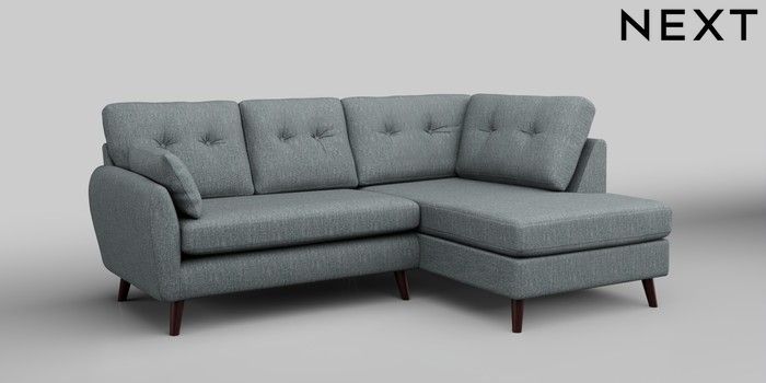 6.12.1 Buy Wilson Buttoned Back Medium Corner Chaise - Right Hand Chunky Weave Mid Blue Retro Tapered - Dark Brown from the Next UK online shop Click here to use our accessible website