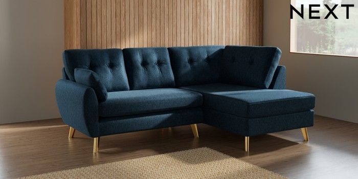 7.2.10 Buy Wilson Buttoned Back Medium Corner Chaise - Right Hand Cotswold Chenille Dark Blue Metal Tapered - Gold from the Next UK online shop Click here to use our accessible website