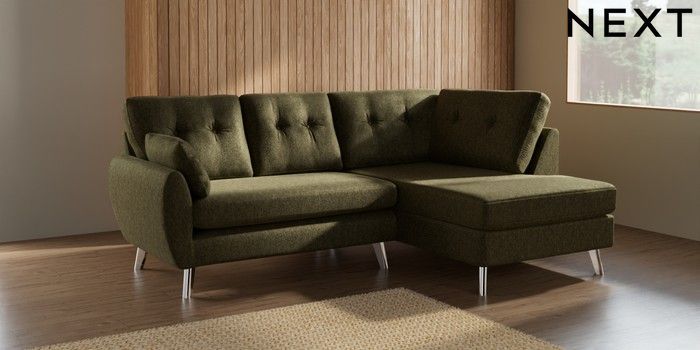 7.2.10 Buy Wilson Buttoned Back Medium Corner Chaise - Right Hand Cotswold Chenille Dark Green Metal Tapered - Chrome from the Next UK online shop Click here to use our accessible website