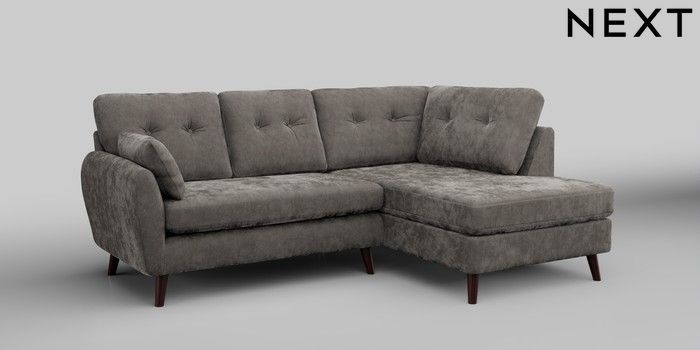 6.12.1 Buy Wilson Buttoned Back Medium Corner Chaise - Right Hand Distressed Velour French Grey Retro Tapered - Dark Brown from the Next UK online shop Click here to use our accessible website