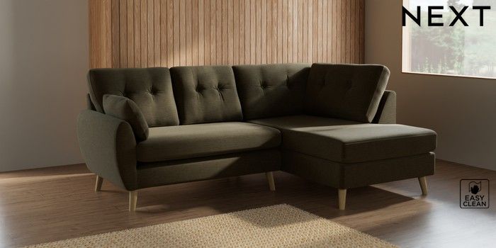 7.2.10 Buy Wilson Buttoned Back Medium Corner Chaise - Right Hand Fine Chenille Easy Clean Dark Moss Green Retro Tapered - Light from the Next UK online shop Click here to use our accessible website