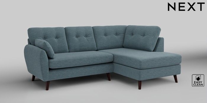 6.12.1 Buy Wilson Buttoned Back Medium Corner Chaise - Right Hand Fine Chenille Easy Clean Mid Blue Retro Tapered - Dark Brown from the Next UK online shop Click here to use our accessible website