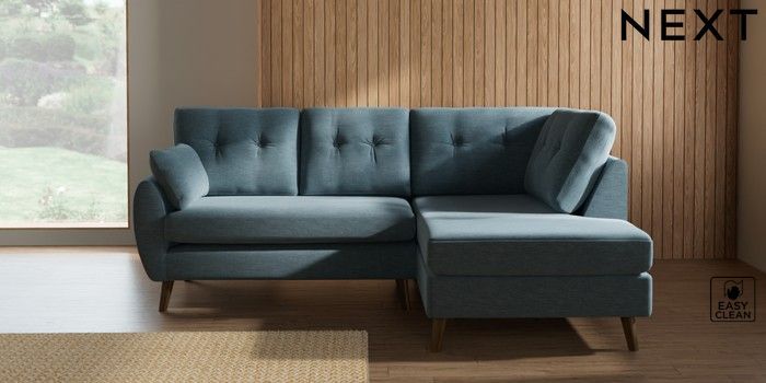 7.3.1 Buy Wilson Buttoned Back Medium Corner Chaise - Right Hand Fine Chenille Easy Clean Mid Blue Retro Tapered - Mid from the Next UK online shop