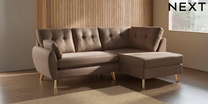 7.2.10 Buy Wilson Buttoned Back Medium Corner Chaise - Right Hand Luxe Chenille Mid Natural Metal Tapered - Gold from the Next UK online shop Click here to use our accessible website