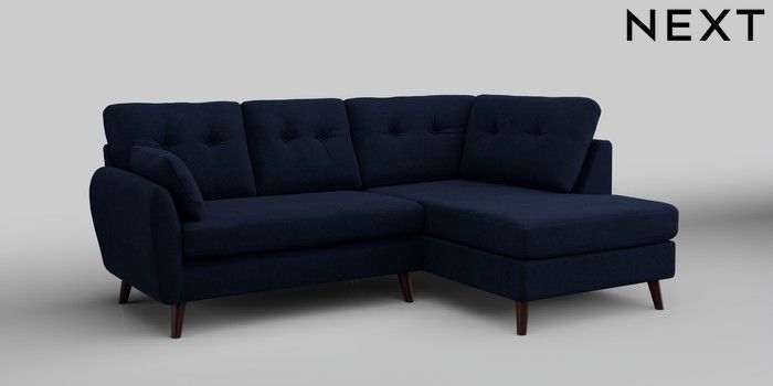 6.12.1 Buy Wilson Buttoned Back Medium Corner Chaise - Right Hand Luxe Chenille Navy Blue Retro Tapered - Dark Brown from the Next UK online shop Click here to use our accessible website