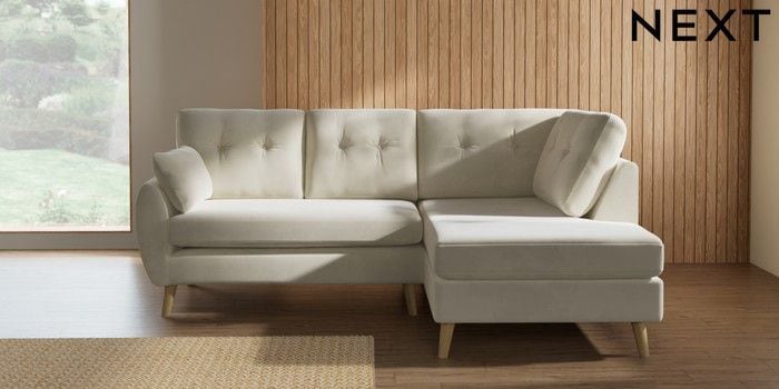 7.3.8 Buy Wilson Buttoned Back Medium Corner Chaise - Right Hand Luxe Chenille Oyster Retro Tapered - Light from the Next UK online shop
