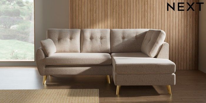 7.3.1 Buy Wilson Buttoned Back Medium Corner Chaise - Right Hand Multi Weave Mid Natural Metal Tapered - Gold from the Next UK online shop