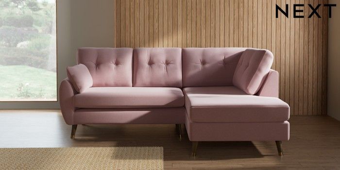 7.3.1 Buy Wilson Buttoned Back Medium Corner Chaise - Right Hand Natural Mix Light Rose Pink Low Retro Tapered Metal Cap - Mid from the Next UK online shop Click here to use our accessible website