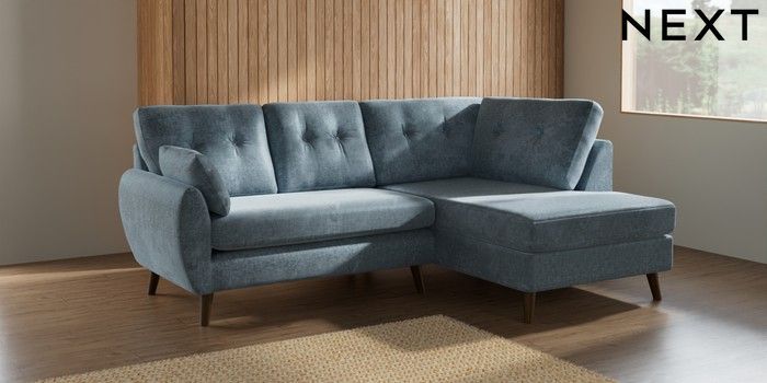 7.2.6 Buy Wilson Buttoned Back Medium Corner Chaise - Right Hand Plush Chenille Light Blue Retro Tapered - Mid from the Next UK online shop Click here to use our accessible website