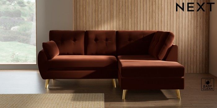7.3.1 Buy Wilson Buttoned Back Medium Corner Chaise - Right Hand Plush Velvet Easy Clean Ginger Orange Metal Tapered - Gold from the Next UK online shop Click here to use our accessible website