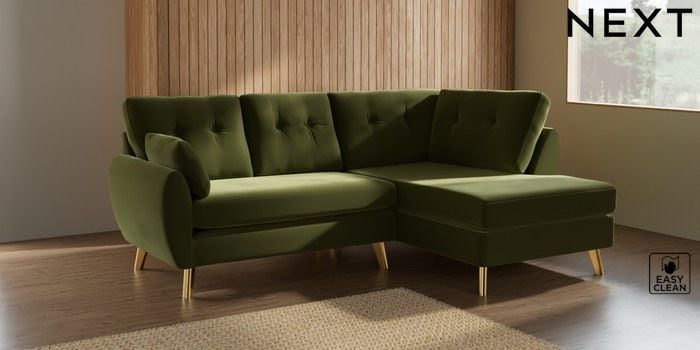 7.3.1 Buy Wilson Buttoned Back Medium Corner Chaise - Right Hand Plush Velvet Easy Clean Mid Olive Green Metal Tapered - Gold from the Next UK online shop Click here to use our accessible website