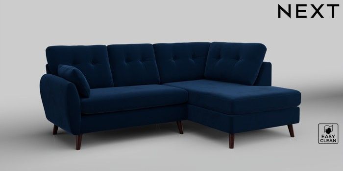 6.12.1 Buy Wilson Buttoned Back Medium Corner Chaise - Right Hand Plush Velvet Easy Clean Navy Blue Retro Tapered - Dark Brown from the Next UK online shop Click here to use our accessible website