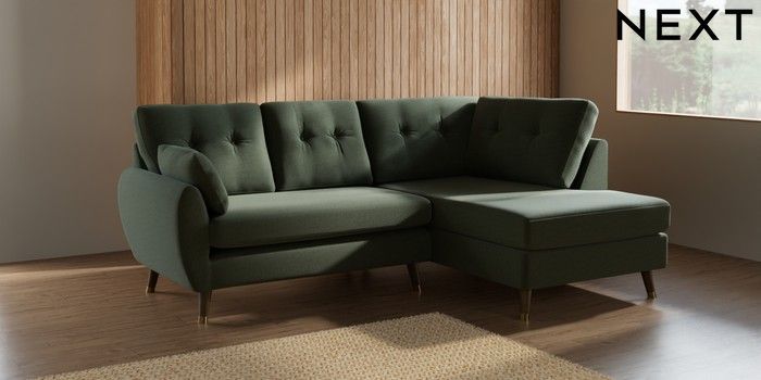7.3.1 Buy Wilson Buttoned Back Medium Corner Chaise - Right Hand Relaxed Linen Look Dark Green Low Retro Tapered Metal Cap - Mid from the Next UK online shop Click here to use our accessible website