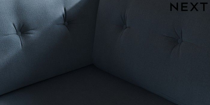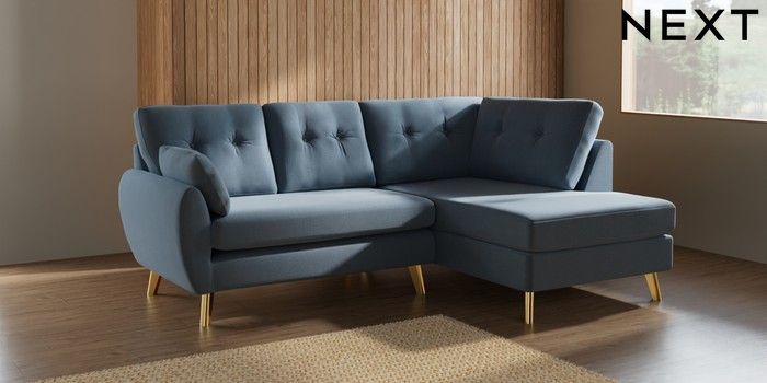 7.3.1 Buy Wilson Buttoned Back Medium Corner Chaise - Right Hand Relaxed Linen Look Mid Blue Metal Tapered - Gold from the Next UK online shop Click here to use our accessible website