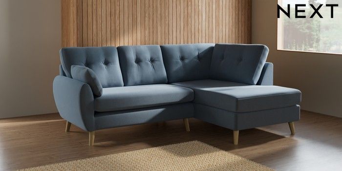 7.2.10 Buy Wilson Buttoned Back Medium Corner Chaise - Right Hand Relaxed Linen Look Mid Blue Retro Tapered - Light from the Next UK online shop Click here to use our accessible website