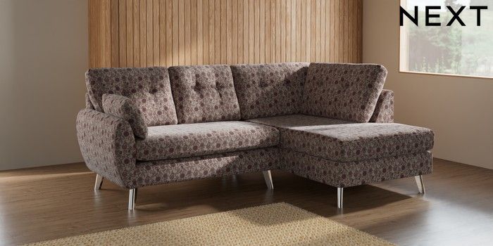 7.2.10 Buy Wilson Buttoned Back Medium Corner Chaise - Right Hand Relaxed Linen Look Print Woodblock Floral Print Pink Metal Tapered - Chrome from the Next UK online shop Click here to use our accessible website