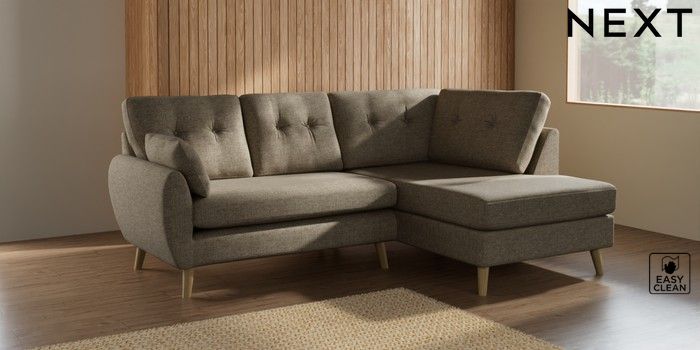7.2.10 Buy Wilson Buttoned Back Medium Corner Chaise - Right Hand Woven Chenille Easy Clean Mid Natural Retro Tapered - Light from the Next UK online shop Click here to use our accessible website