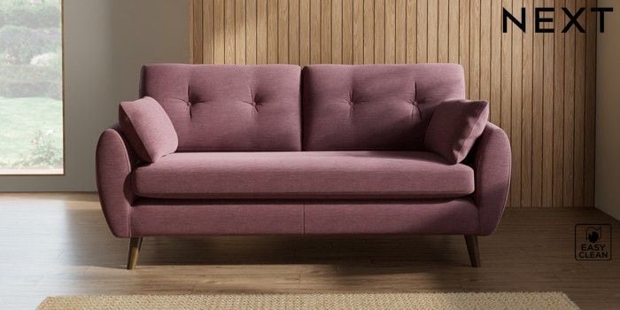 7.2.10 Buy Wilson Buttoned Back 3 Seater Small Sofa Fine Chenille Easy Clean Mid Mulberry Purple Retro Tapered - Mid from the Next UK online shop Click here to use our accessible website
