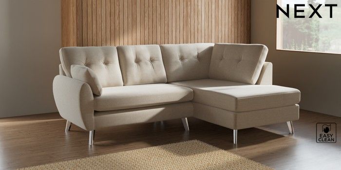 7.2.10 Buy Wilson Buttoned Back Medium Corner Chaise - Right Hand Fine Chenille Easy Clean Oyster Metal Tapered - Chrome from the Next UK online shop Click here to use our accessible website