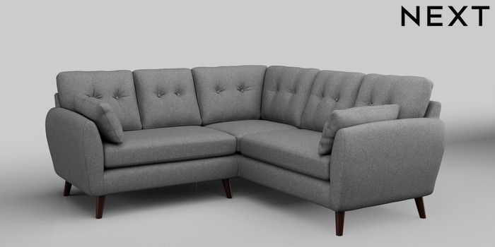 6.12.1 Buy Wilson Buttoned Back Small Corner Sofa - Universal Chunky Weave Mid Grey Retro Tapered - Dark Brown from the Next UK online shop Click here to use our accessible website