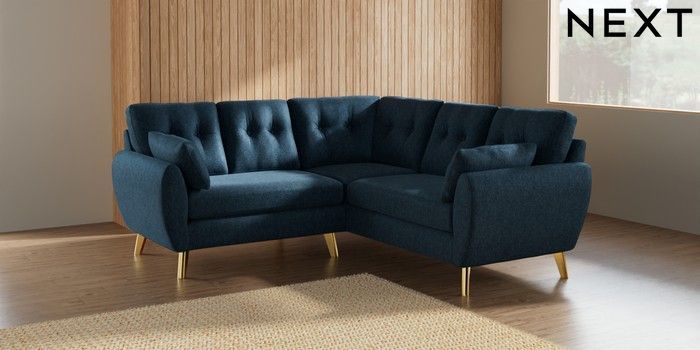 7.2.10 Buy Wilson Buttoned Back Small Corner Sofa - Universal Cotswold Chenille Dark Blue Metal Tapered - Gold from the Next UK online shop Click here to use our accessible website
