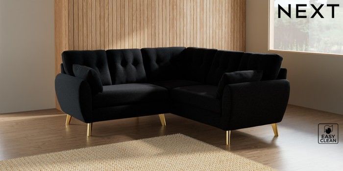 7.2.10 Buy Wilson Buttoned Back Small Corner Sofa - Universal Fine Chenille Easy Clean Black Metal Tapered - Gold from the Next UK online shop Click here to use our accessible website