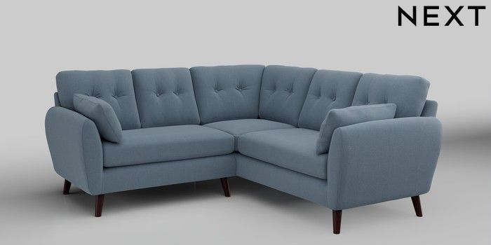 6.12.1 Buy Wilson Buttoned Back Small Corner Sofa - Universal Relaxed Linen Look Mid Blue Retro Tapered - Dark Brown from the Next UK online shop Click here to use our accessible website