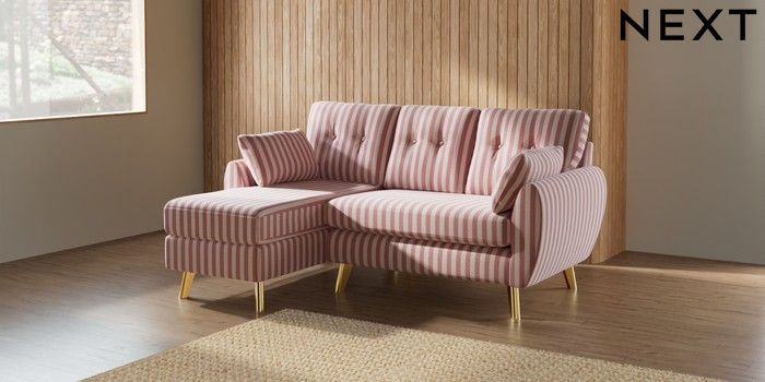 7.2.10 Buy Wilson Buttoned Back Small Sofa Chaise - Left Hand Bold Chenille Stripe Dark Pink Metal Tapered - Gold from the Next UK online shop Click here to use our accessible website