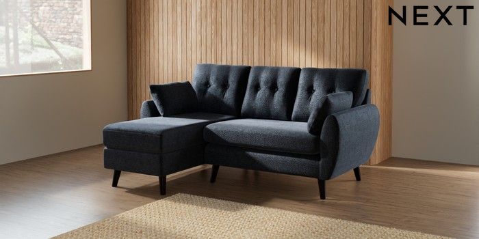7.2.10 Buy Wilson Buttoned Back Small Sofa Chaise - Left Hand Boucle Chenille Dark Slate Blue Retro Tapered - Dark from the Next UK online shop Click here to use our accessible website
