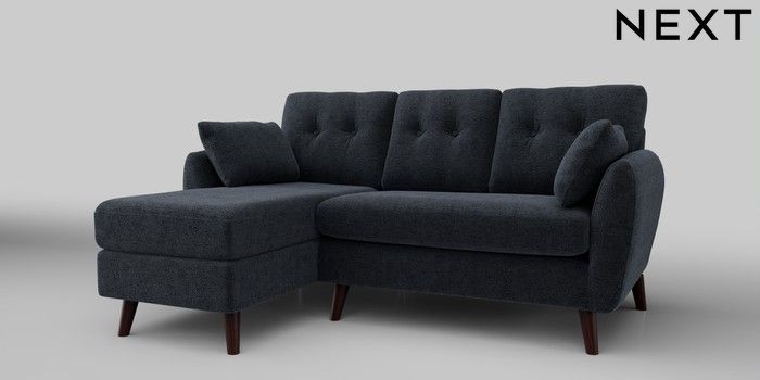 6.12.1 Buy Wilson Buttoned Back Small Sofa Chaise - Left Hand Boucle Chenille Dark Slate Blue Retro Tapered - Dark Brown from the Next UK online shop Click here to use our accessible website