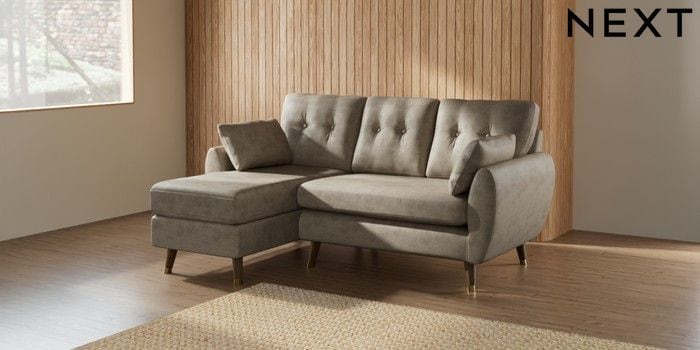 7.3.1 Buy Wilson Buttoned Back Small Sofa Chaise - Left Hand Monza Faux Leather Easy Clean Mink Brown Low Retro Tapered Metal Cap - Mid from the Next UK online shop Click here to use our accessible website
