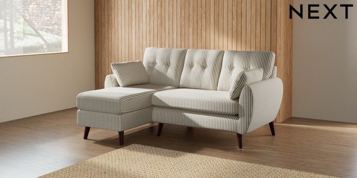 7.2.10 Buy Wilson Buttoned Back Small Sofa Chaise - Left Hand Chenille Stripe Moss Green Retro Tapered - Dark Brown from the Next UK online shop Click here to use our accessible website
