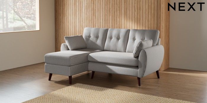 7.2.10 Buy Wilson Buttoned Back Small Sofa Chaise - Left Hand Chenille Stripe Slate Blue Retro Tapered - Dark Brown from the Next UK online shop Click here to use our accessible website