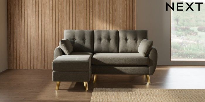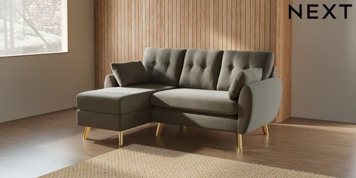 7.3.1 Buy Wilson Buttoned Back Small Sofa Chaise - Left Hand Chunky Marl Light Olive Green Metal Tapered - Gold from the Next UK online shop Click here to use our accessible website