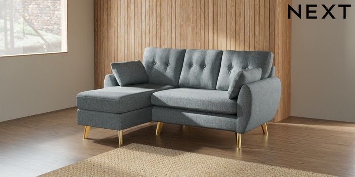 7.2.10 Buy Wilson Buttoned Back Small Sofa Chaise - Left Hand Chunky Weave Mid Blue Metal Tapered - Gold from the Next UK online shop Click here to use our accessible website