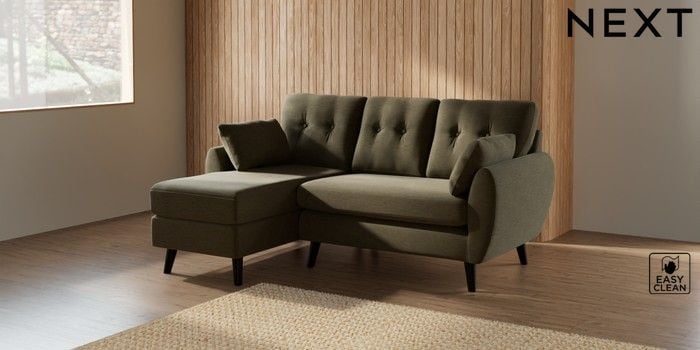 7.3.1 Buy Wilson Buttoned Back Small Sofa Chaise - Left Hand Fine Chenille Easy Clean Dark Moss Green Retro Tapered - Dark from the Next UK online shop Click here to use our accessible website