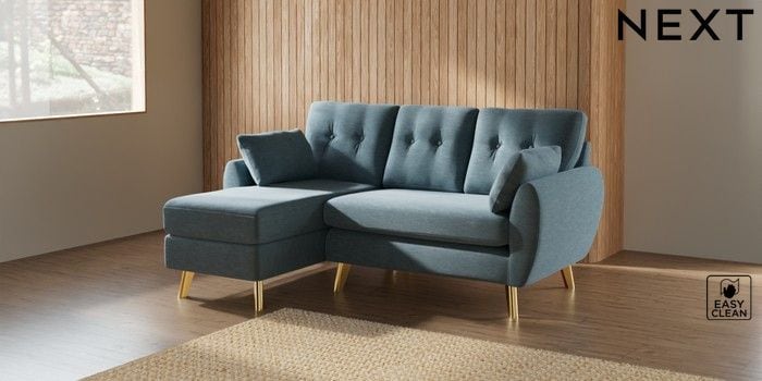 7.3.1 Buy Wilson Buttoned Back Small Sofa Chaise - Left Hand Fine Chenille Easy Clean Mid Blue Metal Tapered - Gold from the Next UK online shop Click here to use our accessible website