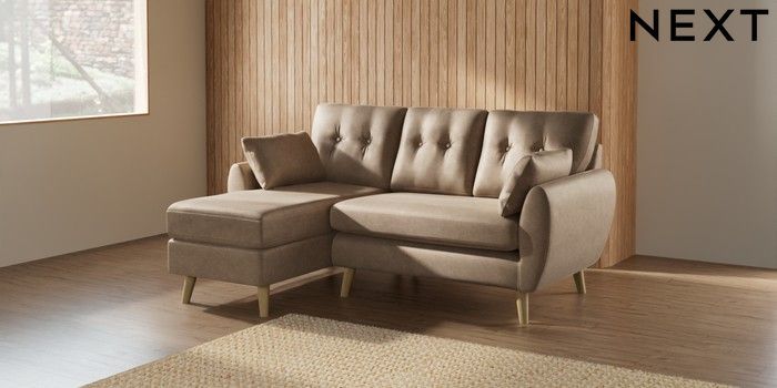 7.2.10 Buy Wilson Buttoned Back Small Sofa Chaise - Left Hand Luxe Chenille Mid Camel Beige Retro Tapered - Light from the Next UK online shop Click here to use our accessible website