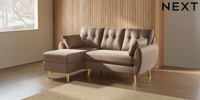 7.2.10 Buy Wilson Buttoned Back Small Sofa Chaise - Left Hand Luxe Chenille Mid Natural Metal Tapered - Gold from the Next UK online shop Click here to use our accessible website