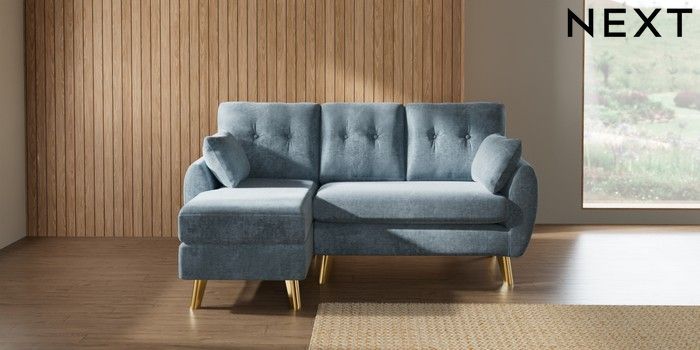 7.3.1 Buy Wilson Buttoned Back Small Sofa Chaise - Left Hand Plush Chenille Light Blue Metal Tapered - Gold from the Next UK online shop