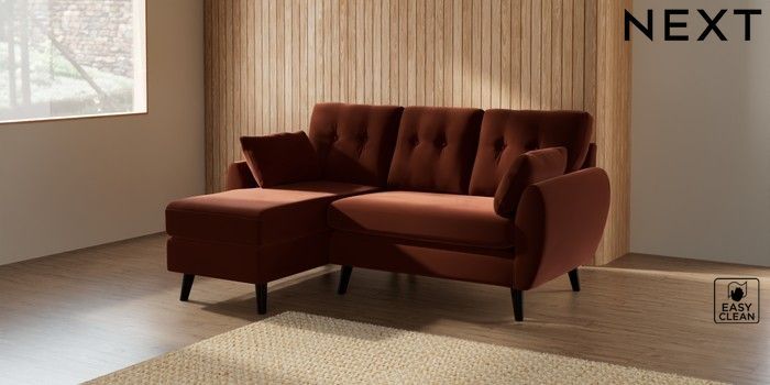 7.2.10 Buy Wilson Buttoned Back Small Sofa Chaise - Left Hand Plush Velvet Easy Clean Ginger Orange Retro Tapered - Dark from the Next UK online shop Click here to use our accessible website