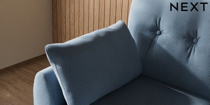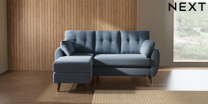 7.3.1 Buy Wilson Buttoned Back Small Sofa Chaise - Left Hand Relaxed Linen Look Mid Blue Low Retro Tapered Metal Cap - Mid from the Next UK online shop Click here to use our accessible website