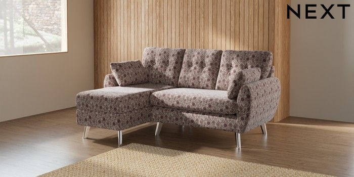 7.2.10 Buy Wilson Buttoned Back Small Sofa Chaise - Left Hand Relaxed Linen Look Print Woodblock Floral Print Pink Metal Tapered - Chrome from the Next UK online shop Click here to use our accessible website