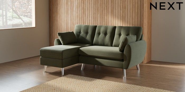 7.2.10 Buy Wilson Buttoned Back Small Sofa Chaise - Left Hand Ripple Chenille Mid Moss Green Metal Tapered - Chrome from the Next UK online shop Click here to use our accessible website