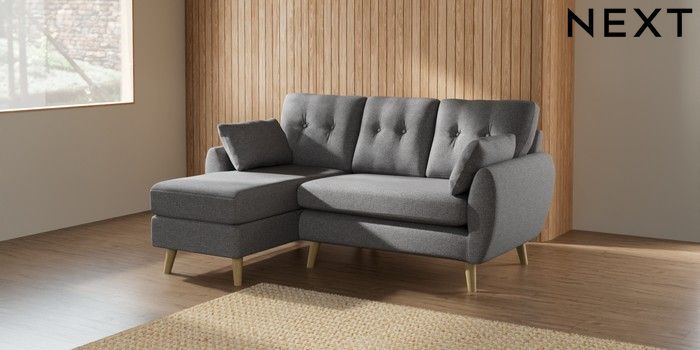 7.2.10 Buy Wilson Buttoned Back Small Sofa Chaise - Left Hand Studio Chenille Mid Grey Retro Tapered - Light from the Next UK online shop Click here to use our accessible website