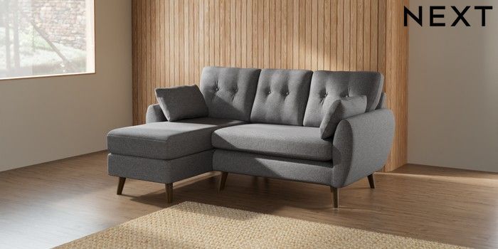 7.2.10 Buy Wilson Buttoned Back Small Sofa Chaise - Left Hand Studio Chenille Mid Grey Retro Tapered - Mid from the Next UK online shop Click here to use our accessible website