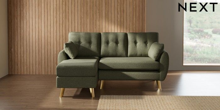7.3.1 Buy Wilson Buttoned Back Small Sofa Chaise - Left Hand Tweedy Chenille Mid Moss Green Metal Tapered - Gold from the Next UK online shop Click here to use our accessible website