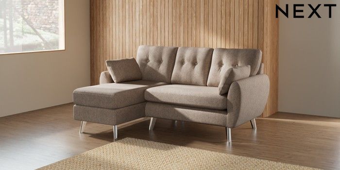 7.3.1 Buy Wilson Buttoned Back Small Sofa Chaise - Left Hand Tweedy Chenille Mid Natural Metal Tapered - Chrome from the Next UK online shop Click here to use our accessible website