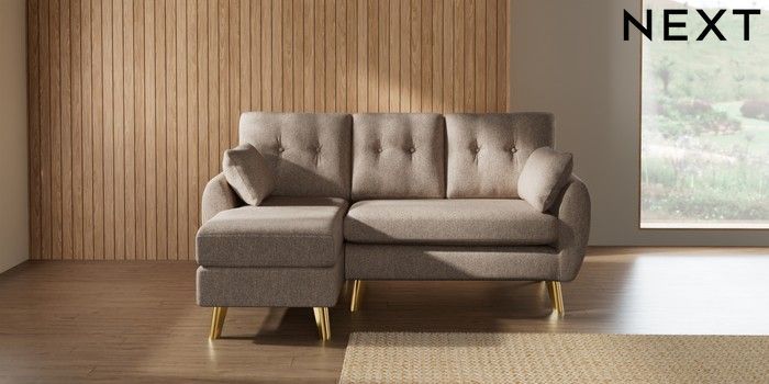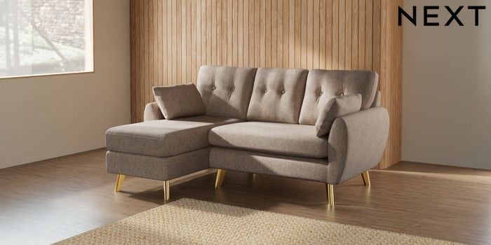 7.3.1 Buy Wilson Buttoned Back Small Sofa Chaise - Left Hand Tweedy Chenille Mid Natural Metal Tapered - Gold from the Next UK online shop Click here to use our accessible website