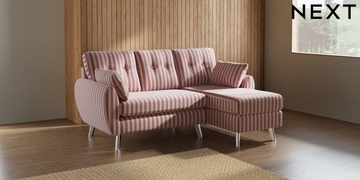 7.2.10 Buy Wilson Buttoned Back Small Sofa Chaise - Right Hand Bold Chenille Stripe Dark Pink Metal Tapered - Chrome from the Next UK online shop Click here to use our accessible website